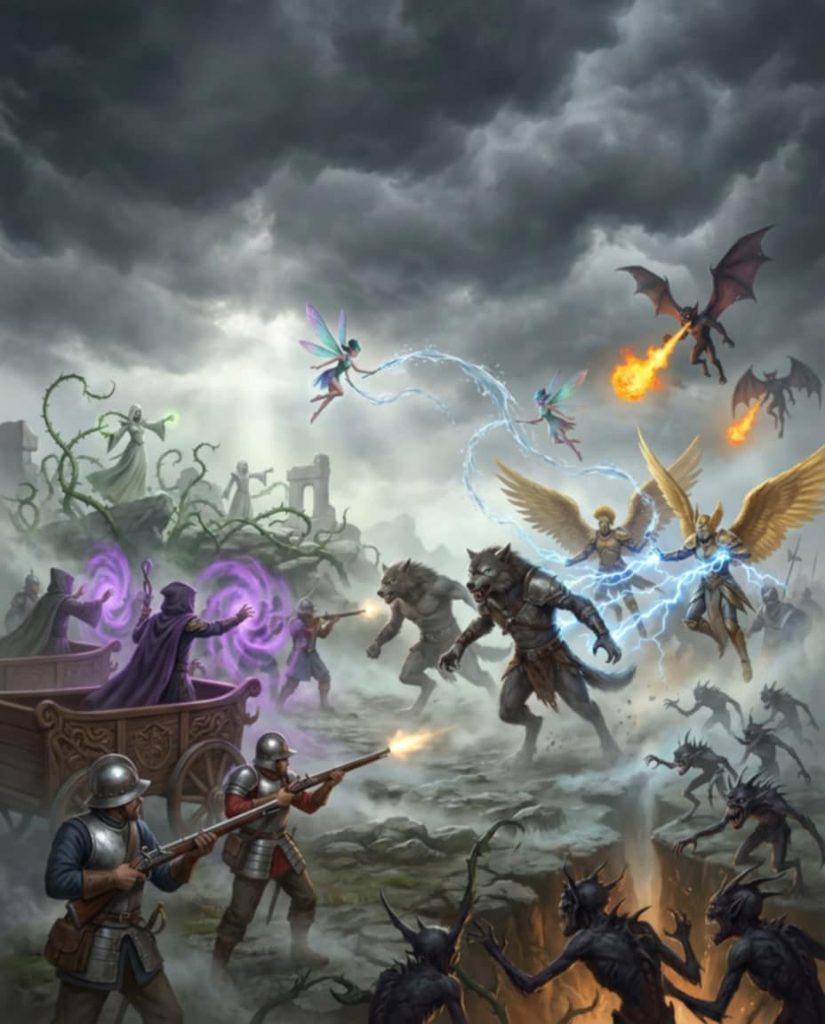 Discover Sorari: Eternal Conflict—the gripping tabletop wargame where ancient gods’ wrath ignites eternal strife across Gaea’s reborn world of Sorari, pitting the divine Firsts—vain Faeries wielding sky elements, shape-shifting Laikavi bound by unbreakable Pack Law, illusion-weaving Pheryl gypsies, blood-thirsty immortal Druids, and innovative Humans—against horrors like the undead Prank abominations birthed from Faery betrayal and the shadowy Abyss. Command dynamic armies with the intuitive Rule of 10 (d10 + stats succeed on 10+), tactical Turn Sequences blending swift Movement, Myst-fueled spells (Water Prisons, Lightning Storms, Mind-shattering Hysteria), brutal Ranged/Melee combat, and morale-shaking Clean Up, all customizable via point-buy upgrades, special qualities (Swiftness, Death Bloom), and faction perks like Knight Orders’ Fast Casting or Laikavi ferocity. Plus, a fast-and-dirty conversion system transforms your minis into playable RPG characters—and back again—seamlessly shifting from narrative quests to massive battles whenever the story demands. Forge legends in a lore-rich saga of mutation, redemption, and divine fury from Mephistopheles’ uprising to Drae-Khan’s curse. Assemble your forces, unleash the Myst, and claim Sorari’s throne today! #SorariEternalConflict #FantasyWargame #RPGWargameHybrid